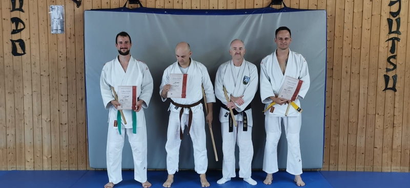 Etwa 30 Minuten später begann dann die eigentliche Prüfung. Zunächst zeigte Andi die Hanbo Kata Sandan, die aus einer Reihe von Schlag-, und Stoßtechniken bestand.
